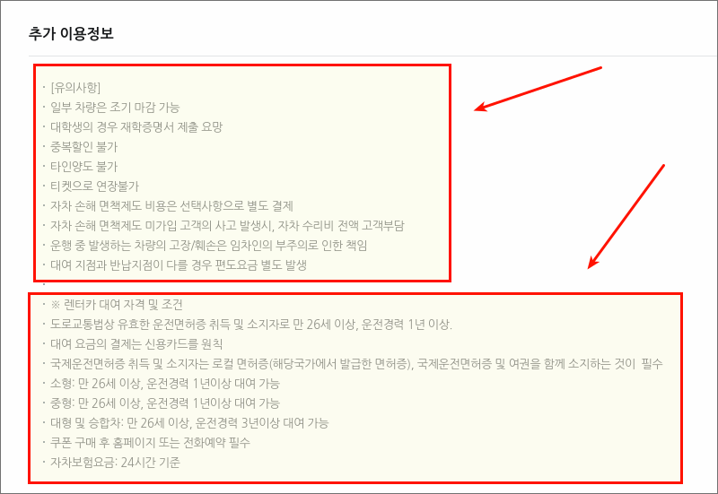 추가 이용정보도 꼼꼼히 살펴보세요. 유의해야 할 사항도 있고, 렌트카를 대여할 때 필요한 자격이나 조건도 명시되어 있어요. 이러한 조건이 충족되지 않으면 이용이 불가하오니 꼼꼼히 확인해 보세요. 애매한 부분은 렌트카 업체에 문의를 한 후 예약을 진행하는 것이 나아요. 먼저 예약을 하면 귀찮게 취소해야 하거든요.