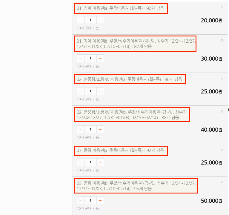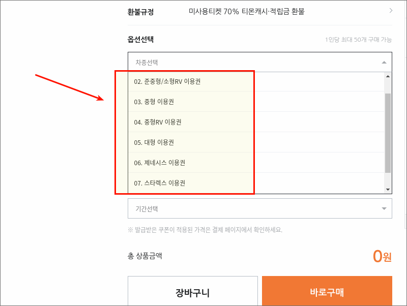 판매글에서 요금표 보는 방법을 알려드릴게요. 옵션 선택에서 "차종 선택"을 클릭해 보세요. 그럼 소형, 준중형, 소형RV, 대형, 제네시스, 스타렉스 등 여러 차종에 대한 이용권을 선택할 수 있어요.
