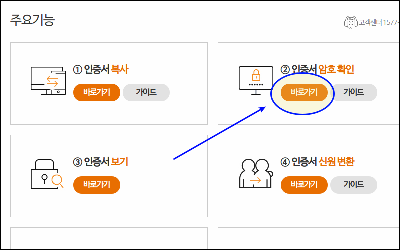 인증서 관리 페이지가 열렸어요. 이곳에서는 공동인증서에 대한 다양한 것을 해볼 수 있는 곳이에요. 복사, 보기, 신원 변환 등 여러 가지가 있는데요. 여기에서 공동인증서 암호찾기를 위해서는 두 번째 서비스를 선택하면 돼요. "인증서 암호 확인"에 대한 바로가기 버튼을 클릭해 주세요.