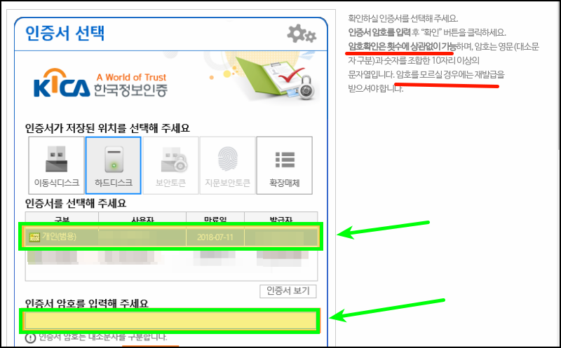 이렇게 공동인증서를 선택할 수 있는 창이 하나 열려요. 평소에 은행이나 관공서 사이트에 접속할 때와 유사한 모습인데요. 우측에 있는 안내를 보면 횟수 상관 없이 함호를 입력할 수 있다고 해요. 계속 자신이 주로 사용하는 비밀번호를 넣어보면서 암호찾기를 진행하면 돼요. 도저히 암호를 모르는 경우에는 공동인증서 재발급을 진행해야 해요. 암호찾기를 할 때 도움이 될만한 팁을 하나 알려드릴게요. 공동인증서 암호의 경우 영문(대소문자 구분)과 숫자를 조합한 10자리 이상의 문자열이에요. 이점을 감안하고 머릿속에서 암호를 찾아보면 도움이 될 거에요.