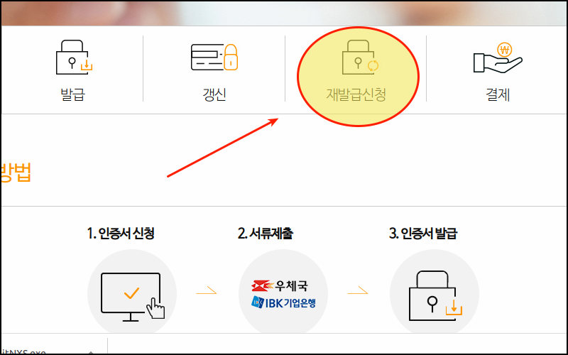 새롭게 열린 페이지를 보면 공동인증서에 대한 발급, 갱신, 재발급 신청을 할 수 있는 메뉴를 만나볼 수 있어요. 여기서 "재발급 신청" 버튼을 클릭한 후 안내에 따라 진행하면 돼요.