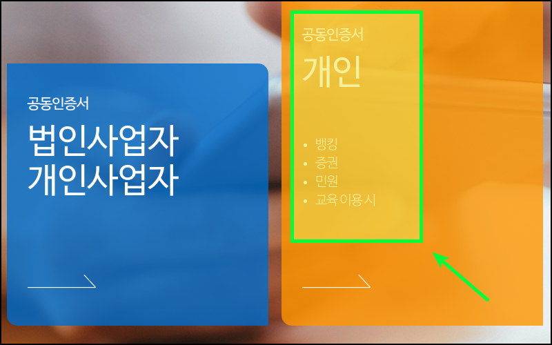 제가 알려드린 방법을 이용했음에도 암호찾기에 실패할 수 있어요. 기억이 나질 않으면 결국 찾지 못하는데요. 이럴 때에는 공동인증서를 제발급 받는 선택을 생각해 보셔야 해요. 처음 한국정보인증 사이트에 접속했을 때 "개인" 또는 "사업자"를 선택해 주세요. 본인이 사용하는 공동인증서 타입에 맞는 것을 선택하면 돼요.