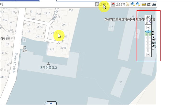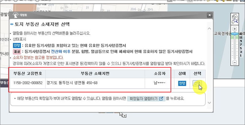 상세 지도에서 등기부등본을 열람하고 싶은 지역을 찾아주세요. 화면 우측에 있는 메뉴를 통해 확대가 가능한데요. 찾는 위치를 최대한 확대한 후 우측 상단에 있는 "선택" 버튼을 클릭해 주세요.