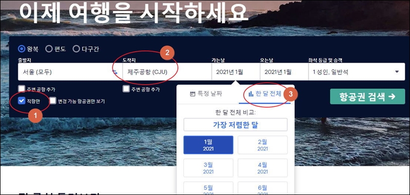 스카이스캐너를 통해 제주항공권을 저렴하게 구입하는 방법을 알려드릴게요. 일단 사이트 메인화면에서 찾고자 하는 항공권에 대한 정보를 입력해 주세요. 도착지는 제주를 입력해주시면 되고, 가는날과 오는날의 경우 "한 달 전체"를 선택해주시면 돼요. 그럼 해당 월에 가장 싸게 판매되는 날을 알 수 있어요.