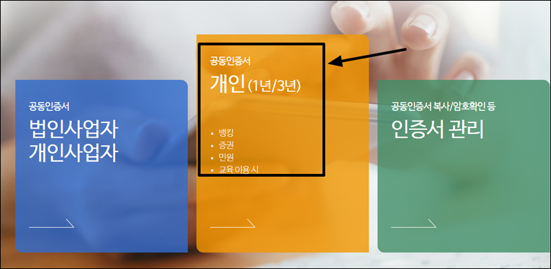 인증서 사용 용도를 생각해보시고, 개인 또는 사업자 메뉴를 선택해 주세요.