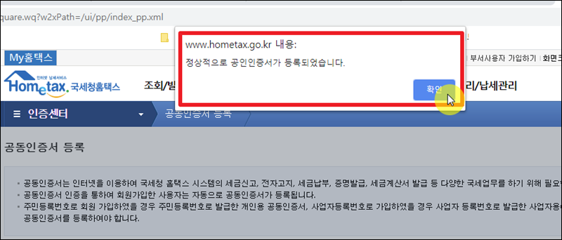 암호 입력 후 확인 버튼을 누르면 이렇게 완료가 되었다는 알림을 받을 수 있습니다. 여기서 확인 버튼을 누른 후 공동인증서로 로그인을 해봅니다. 이런 식으로 제대로 등록되었는지 확인하면 됩니다.