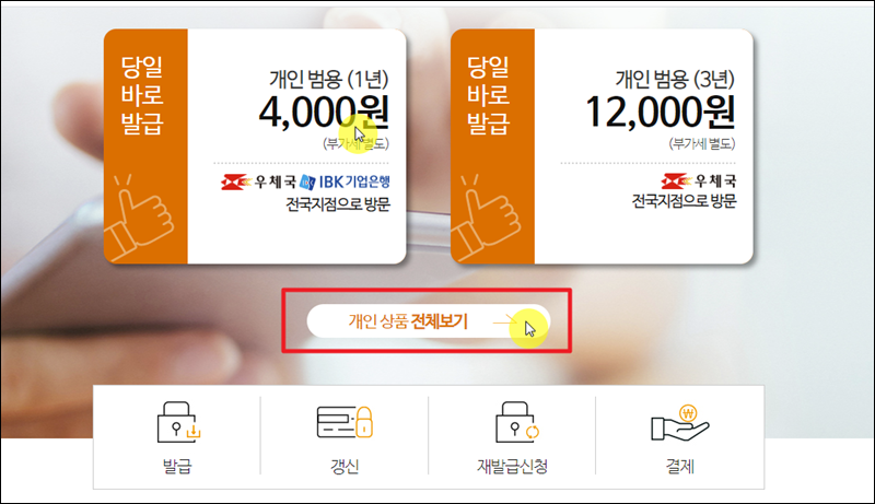 여기서 발급 받을 수 있는 인증서는 여러 가지가 있습니다. 대표적으로 범용 인증서가 있는데요. 하나의 인증서로 다양하게 쓰일 수 있다는 장점이 있습니다. 수수료가 다른 상품에 비해 비싸다는 것이 흠이지만요. 홈택스 공동인증서의 경우 "개인 상품 전체보기"를 클릭하면 만나볼 수 있습니다.