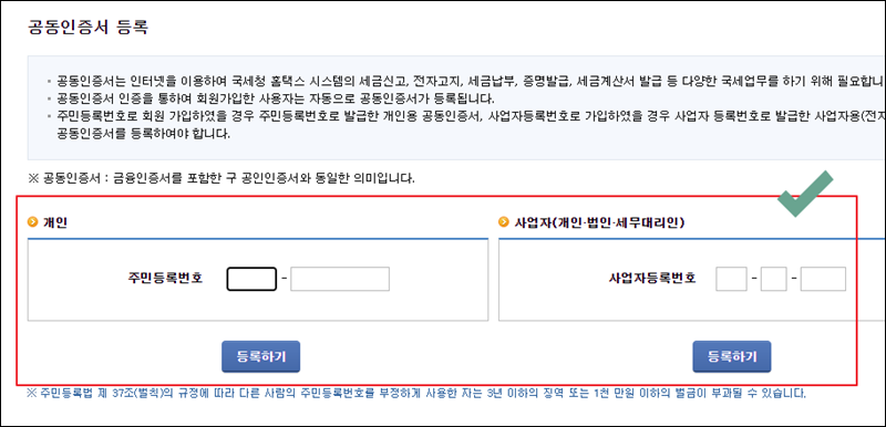 홈택스를 가입할 때에는 주민번호 또는 사업자번호를 사용하게 되는데요. 본인이 가입할 때 어떤 것을 사용했는지에 따라 개인 또는 사업자에 있는 "등록하기" 버튼을 클릭하면 됩니다. 당연히 해당 번호는 정확하게 입력해야 해요.