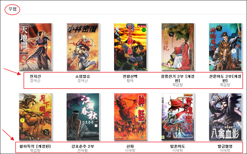 최근에 올라온 무협 작품의 경우에는 정여산의 천지간과 소림밀승, 황재의 천왕신맥, 묵검향의 창룡전기, 전륜마도, 월하독작, 천제황의 강호춘추, 이재학의 전화, 탈혼마도, 팔금혈영이 올라왔네요. 완결된 작품의 경우 전권으로 처음부터 끝까지 감상이 가능해요.