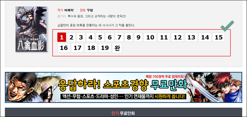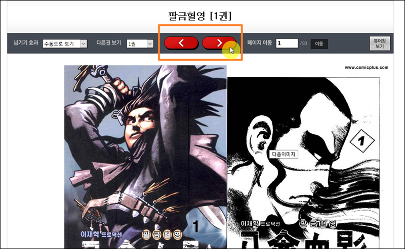 무협 만화 작가로 유명한 이재학 작가의 팔금혈영을 선택했어요. 해당 작품의 썸네일 또는 제목을 마우스로 클릭해 보세요. 그럼 다음과 같이 바로 무료만화보기 가능한데요. 화면 중앙 상단에 있는 화살표를 통해 이전 페이지 또는 다음 페이지로 넘길 수 있어요.