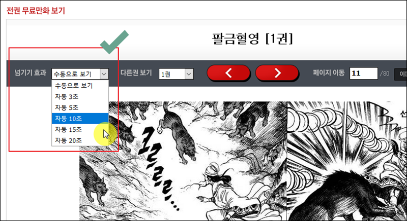 무언가 먹으면서 만화를 볼 때에는 넘기기 효과 기능을 활용해 보세요. 자동으로 3초에서 20초 사이로 페이지 넘기기가 가능해요. 손 하나 까딱하지 않고, 처음부터 끝까지 무료만화보기 할 수 있어요.