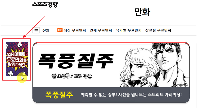 스포츠경향 사이트에 접속했어요. 가장 먼저 무료만화보기 이전에 사이트 좌측 상단에 있는 "업데이트 된 무료만화를 확인하세요."를 클릭해 보세요. 그럼 최근에 업데이트 된 작품들이 무엇이 있는지 알아볼 수 있어요.