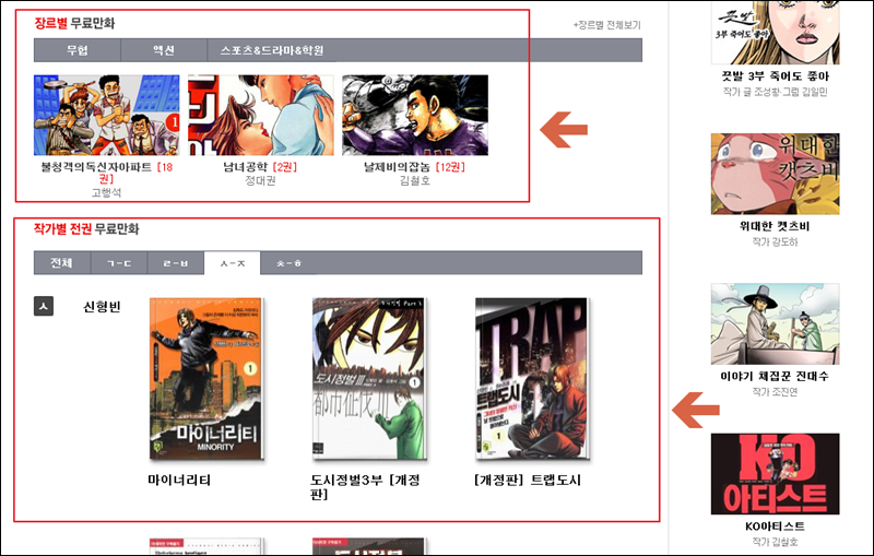 메인화면에서 스크롤을 조금 내려보면 장르별 및 작가별 전권 무료만화 섹션이 나타나요. 좋아하는 작가가 있다면 찾아보세요. 해당 작가의 작품에 대하여 전권을 무료로 감상할 수 있어요.