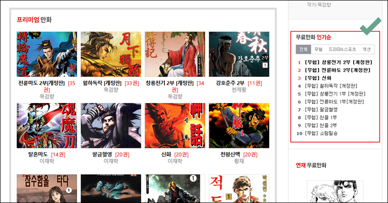 다시 메인화면을 통해 전권 무료만화보기 방법을 알려드릴게요. 일단 재미있는 작품을 골라야 하는데요. 메인화면 중앙에 있는 프리미엄 만화 섹션을 보면 퀄리티 높은 작품들을 전권으로 만나볼 수 있어요. 사이트 우측에는 여기서 볼 수 있는 작품에 대한 인기 순위를 확인할 수 있는데요. 전체 순위와 장르별 순위가 있어요. 처음 무료만화보기 서비스를 이용하신다면 인기 순위가 높은 작품을 추천 드리고 싶네요.