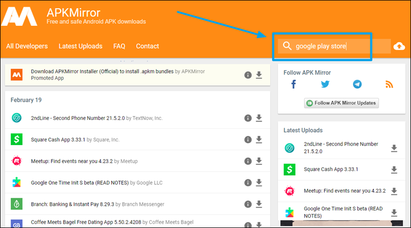apkmirror 사이트를 이용하면 play스토어를 포함한 여러 가지 apk 파일을 다운로드 받을 수 있는데요. 사이트 메인화면을 보면 여러 가지 어플리케이션이 눈에 띌 꺼에요. 최신 버전은 물론이고, 이전 버전의 apk 파일도 구할 수 있는 곳이에요. play 스토어의 apk 파일을 찾으려면 사이트 우측 상단에 있는 검색 기능을 이용하면 돼요. 검색창에 google play store를 입력한 후 엔터키를 눌러 주세요.