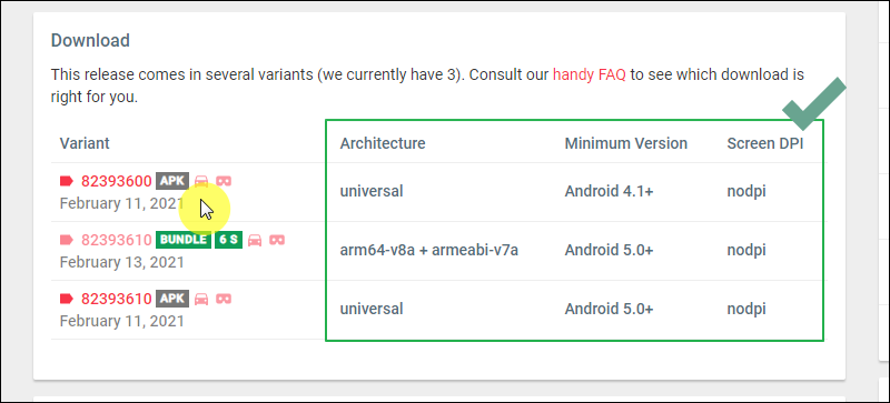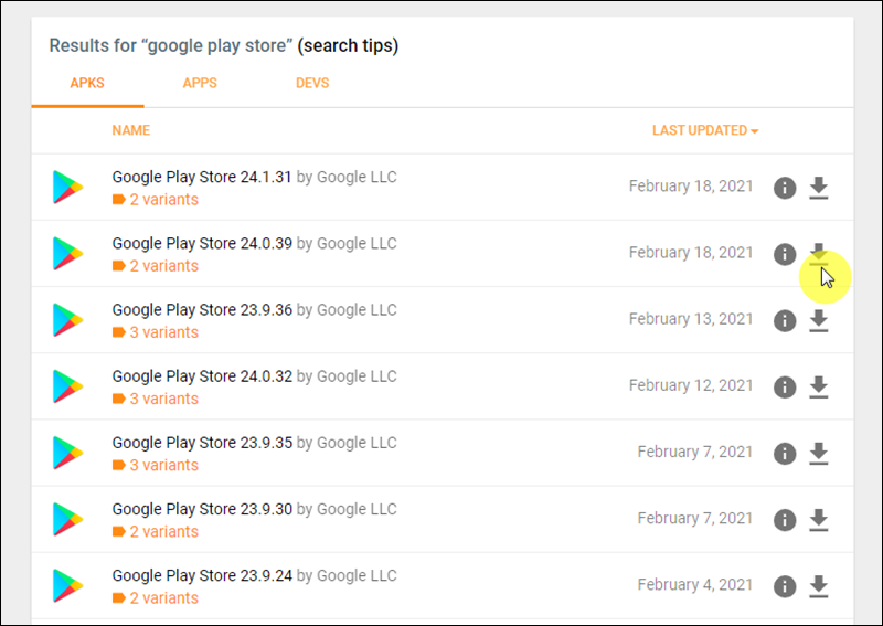 이전 단계에서 언급한 바와 같이 여러 버전의 play스토어 apk 파일이 나타났어요. 여기에서 play스토어를 설치할 기기에 맞는 것을 선택해 주세요. 어떤 것을 다운로드 받아야 할지 모를 때에는 현재 문제가 있는 버전보다 이전에 나온 버전을 선택하면 돼요. 좀 더 정확하게 알아보고 싶다면 해당 기기를 사용하는 네이버 카페 모임에서 알아보면 돼요. 워낙 많은 기기가 있기 때문에 제가 하나씩 설명드릴 수 없는 점 이해해 주세요.