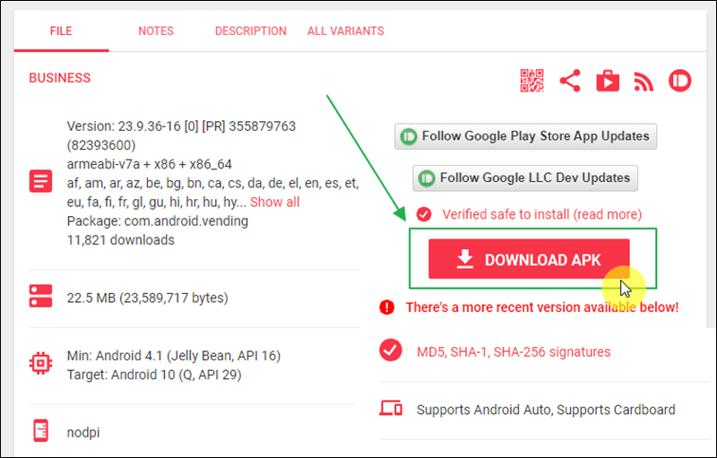 마지막으로 우리가 다운로드 받으려고 하는 play 스토어 설치 파일에 대한 상세 설명을 확인할 수 있어요. target은 권장 사양을 의미하오니 참고해 주세요. 설명을 한 번 훑어본 후에 "DOWNLOAD APK"를 클릭하면 apk 파일에 대한 다운로드가 진행돼요.