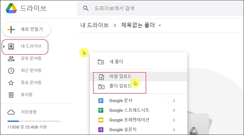 새로운 페이지를 통해 윈도우 운영체제에서 사용하던 "내 컴퓨터"와 비슷한 화면을 확인할 수 있을 거에요. 좌측에 있는 소메뉴에서 "내 드라이브"를 클릭해 보세요. 그 다음 우측에 있는 영역에 마우스 우클릭을 해보세요. 그럼 파일 업로드 및 폴더 업로드를 할 수 있는 버튼이 나타나요. 또 다른 방법으로는 해당 화면에 파일을 끌어서 드래그하는 방법이 있어요. 둘 중에 편한 방법을 사용하면 돼요.