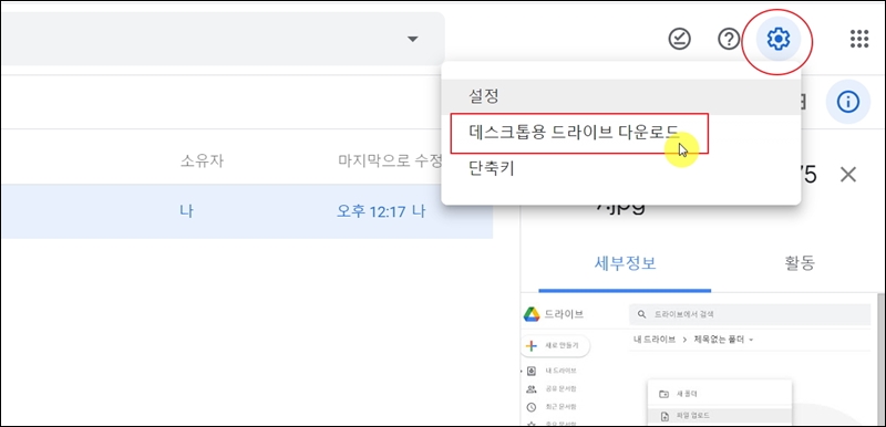자동으로 구글 드라이브에 파일을 업로드하는 방법을 알려드릴게요. 해당 사이트에서 우측 상단에 있는 톱니바퀴 모양의 아이콘을 클릭해 보세요. 그럼 데스크톱용 드라이브를 다운로드 받을 수 있는데요. 해당 프로그램을 이용하면 자동으로 내 컴퓨터에 있는 파일이나 폴더에 대한 업로드가 가능해요.