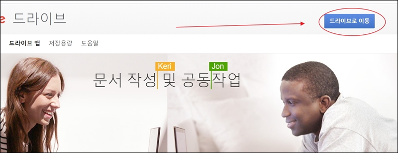 구글 드라이브 사이트에 접속했어요. 해당 프로그램을 통해 이용할 수 있는 서비스 여러 가지에 대한 설명이 나타나는데요. 한 번 읽어본 후에 사이트 우측 상단에 있는 "드라이브로 이동"을 클릭해 주세요.
