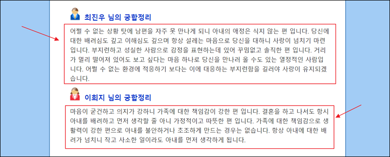 총평에 대한 상세한 풀이도 볼 수 있는데요. 자세하게 우리 관계에 대해 알아보고 싶을 때 꼼꼼히 읽어보세요. 아내의 애정이 식지 않는 편이라고 하고, 결혼하고 나서도 항시 아내를 배려할 수 있다고 하네요. 이런 식으로 두 사람 관계가 어떠한지는 물론이고, 어떻게 하면 좀 더 나은 관계가 되는지 알려줘요.
