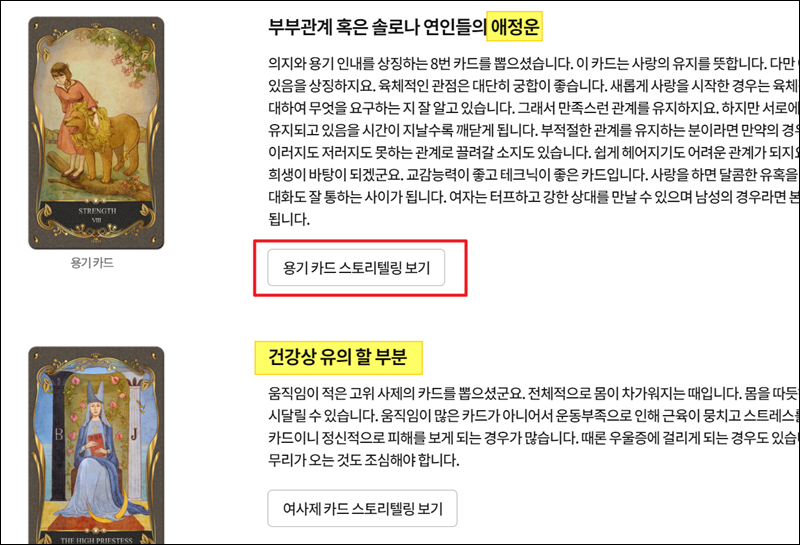 저는 애정운으로 용기 카드를 뽑았고, 건강상 유의할 부분에 관련하여 여사제 카드를 뽑았네요. 이렇게 타로카드점은 본인이 어떤 카드를 뽑았느냐에 따라 해석이 달라지기 때문에 조금은 주체적인 느낌이 들어요.