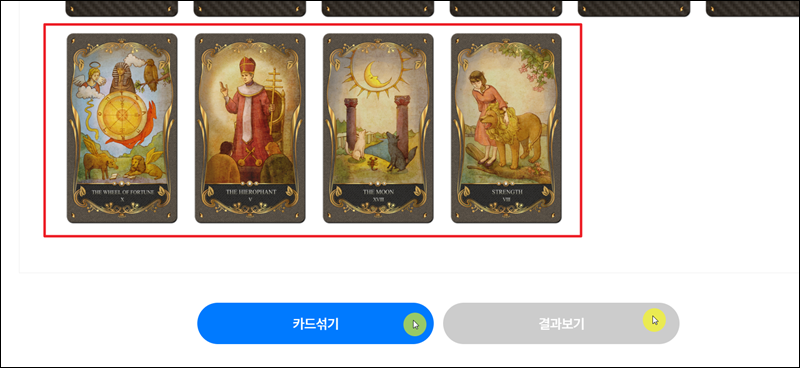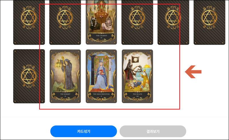 앞서 살펴본 바와 같은 카드 뽑기 화면이 나타났어요. 마음을 가다듬고, 집중을 한 상태에서 카드를 몇 장 선택해 주세요. 실수로 마우스 클릭을 잘못한 경우라면 "카드 섞기"를 눌러 초기화 해주면 돼요. 모두 선택하면 "결과 보기" 버튼이 활성화 되는데요. 활성화된 버튼을 클릭해 주세요.