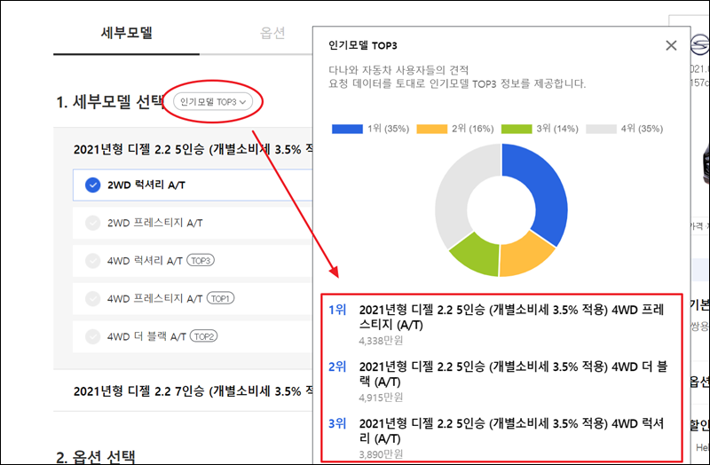 여기서부터 본격적으로 쌍용자동차 신차 구입 시 얼마의 비용이 발생하는지 정확하게 알아볼 수 있어요. 첫 번째로 세부모델을 선택해 주세요. 어떤 모델을 구매할지 결정을 하지 않은 상태라면 "인기모델 TOP3"를 참고해 주세요.