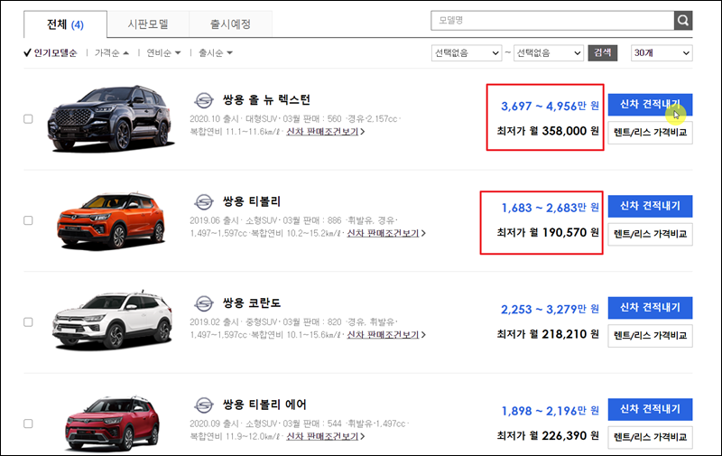 간단히 알아볼 수 있는 쌍용자동차 신차가격표가 나타났어요. 리스트를 통해 여러 차량에 대한 정보를 쉽게 비교해볼 수 있게 되어 있는데요. 여기 있는 정보만으로는 부족하다는 느낌이 드신다면 우측에 있는 "신차 견적내기" 버튼을 클릭해 주세요.