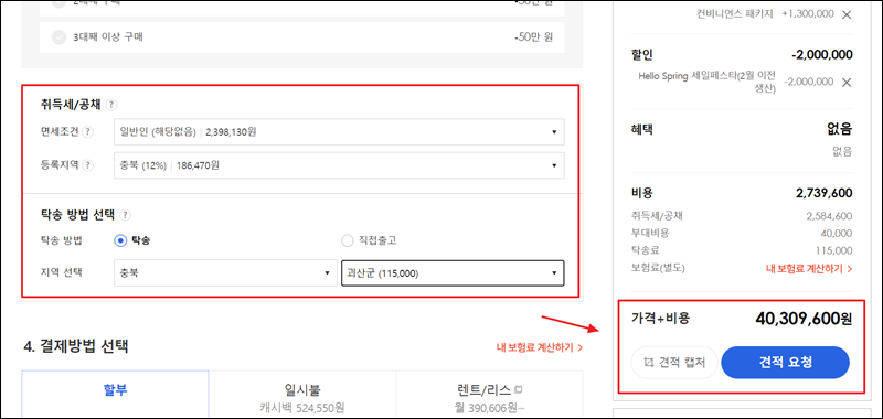 마지막으로 취득세나 공채 비용과 탁송료에 관한 정보를 입력해 주세요. 그럼 사이트 우측에 있는 신차가격표를 통해 내가 쌍용자동차를 구매할 때 최종적으로 얼마의 비용이 발생하는지 알 수 있어요.