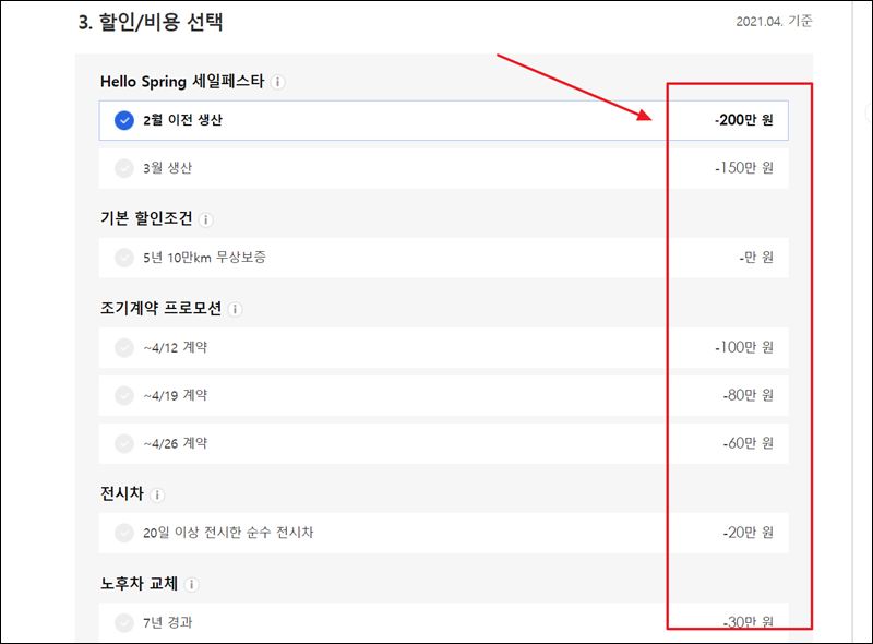 매월마다 쌍용자동차에서 차량 구입 시 혜택이나 이벤트를 제공하는데요. 이러한 것을 판매조건이라고 해요. 현재 2021년 4월 기준으로 판매조건이 적용되고 있는데요. 본인이 이용할 수 있는 조건을 선택해 주세요.