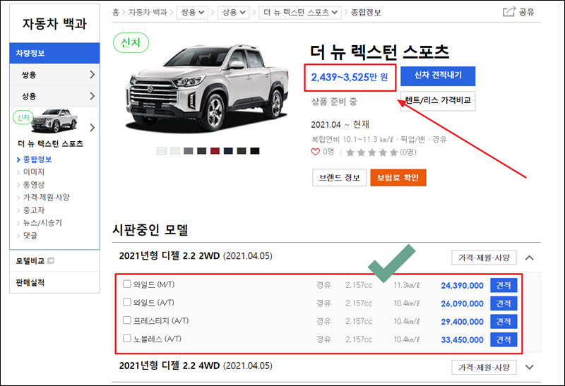일반적으로 신차가격표를 알아보게 되면 이렇게 금액이 범위 형식으로 되어 있어요. 최근에 출시한 더 뉴 렉스턴 스포츠의 경우 2,439만원에서 3,525만원 사이의 금액을 형성하고 있네요.
