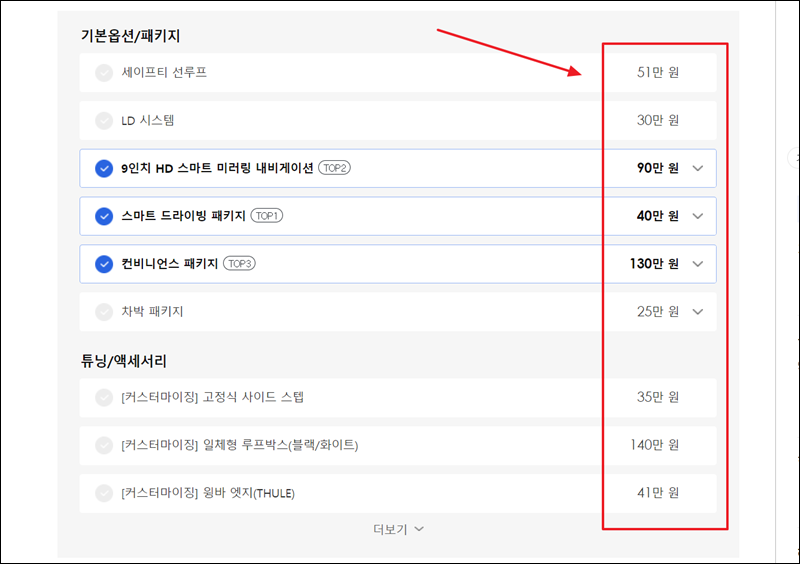 옵션 선택을 어떻게 하느냐에 따라 신차의 가격 차이가 많거나 또는 적게 날 수 있는데요. 처음 차량을 구입하는 분들은 어떤 옵션이 좋은지 모를 수 있어요. 이러한 경우에는 TOP 표시가 된 것 위주로 추천 드려요. 옵션 가격표에서 오른편에 있는 화살표를 클릭해 보면 해당 옵션에 대한 설명을 볼 수 있어요.