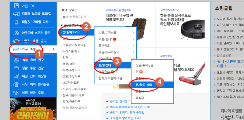 다나와 사이트에 접속하면 메인화면에서 좌측에 있는 "가구 및 조명"을 클릭해 보세요. 하위 메뉴에서는 침대, 흙침대를 차례대로 선택하면 돼요.