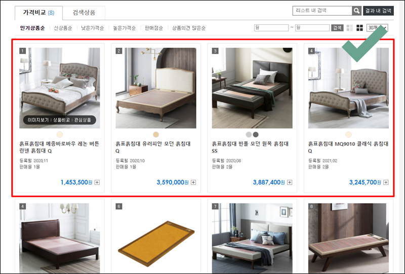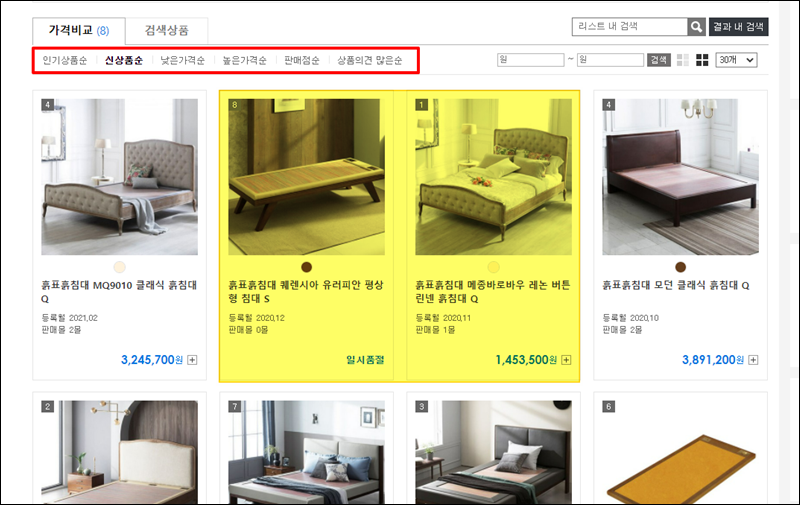 다나와 사이트에서 살펴볼 수 있는 흙표흙침대 상품이 8개 나타났어요. 리스트 상단을 보면 인기상품순, 신상품순, 낮은가격순, 상품의견 많은 순 등으로 정렬이 가능해요. 리스트 상에 나타난 가격을 통해 단순 비교가 가능한데요. 마음에 드는 상품을 클릭하면 더 자세한 정보를 확인할 수 있어요.