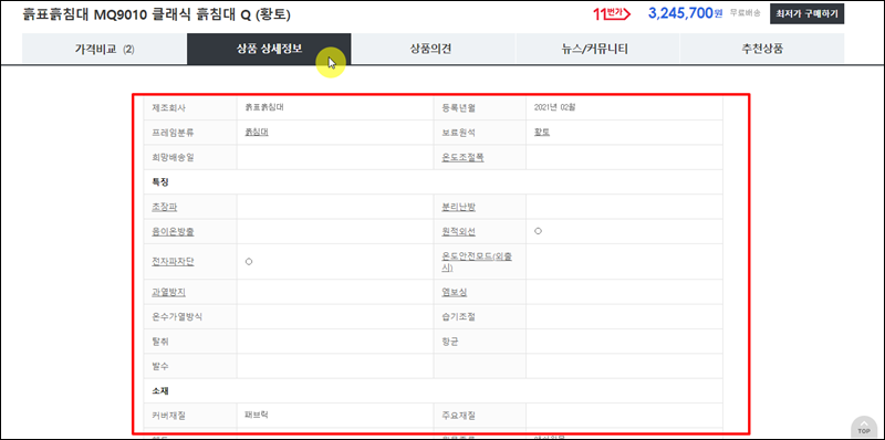 화면 아래쪽에 있는 "상품 상세정보" 탭을 클릭해 보세요. 그럼 등록년월, 보료원석, 프레임 종류는 물론이고, 전자파 차단, 원적외선 등 특징을 알아볼 수 있어요.