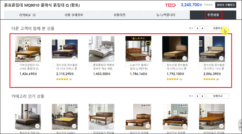 추천상품 탭을 누르면 우리가 선택한 흙표흙침대를 살펴본 사람들이 함께 본 상품을 확인할 수 있는데요. 상품비교 버튼을 누르면 좀 더 스마트하게 비교를 해볼 수 있어요. 가격 외에 별점도 표시가 되어 있기 때문에 이를 통해서도 비교가 가능해요.