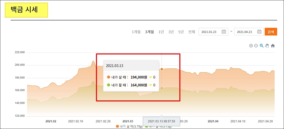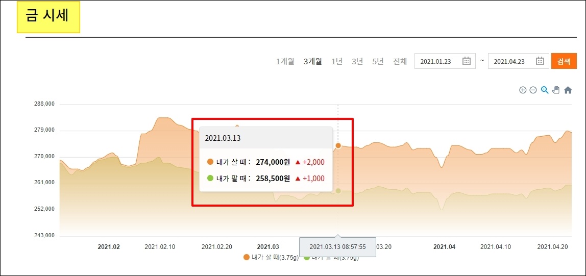 메뉴에 있는 금시세조회 버튼을 누르면 좀 더 많은 가격 정보를 얻을 수 있습니다. 그래프를 통해 여러 기간에 걸쳐 금에 대한 가격이 어떻게 변하는지 알 수 있는데요. 앞으로 오를지 또는 떨어질지 예측할 때 참고하기에도 좋습니다.