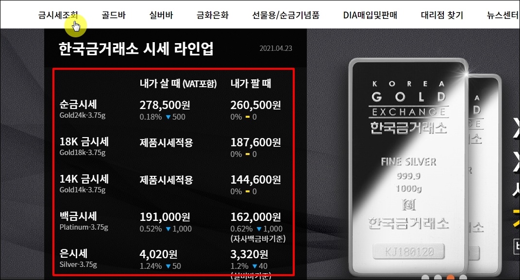 금에 관련된 시세를 알아볼 때에는 한국금거래소 사이트를 이용하면 됩니다. 이곳에서는 금일 시세를 확인할 수 있기 때문에 금괴 가격을 파악하기에 정말 좋아요.