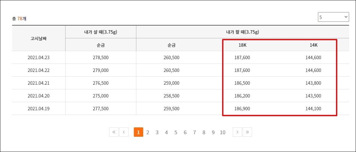 사이트에 접속하면 바로 시세 라인업을 확인할 수 있습니다. 순금, 18k, 14k, 백금, 은에 대한 시세를 확인할 수 있는데요. 내가 살 때와 팔 때의 가격에 있어서 차이가 있습니다. 아마도 거래 수수료가 있기 때문이 아닐까 생각이 됩니다. 여기 나온 시세는 3.75g 기준인데요. 10kg은 3.75의 2,667배 정도되기 때문에 여기서 이만큼 곱하면 됩니다.