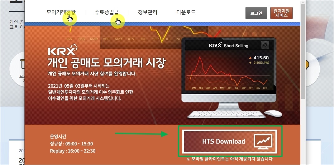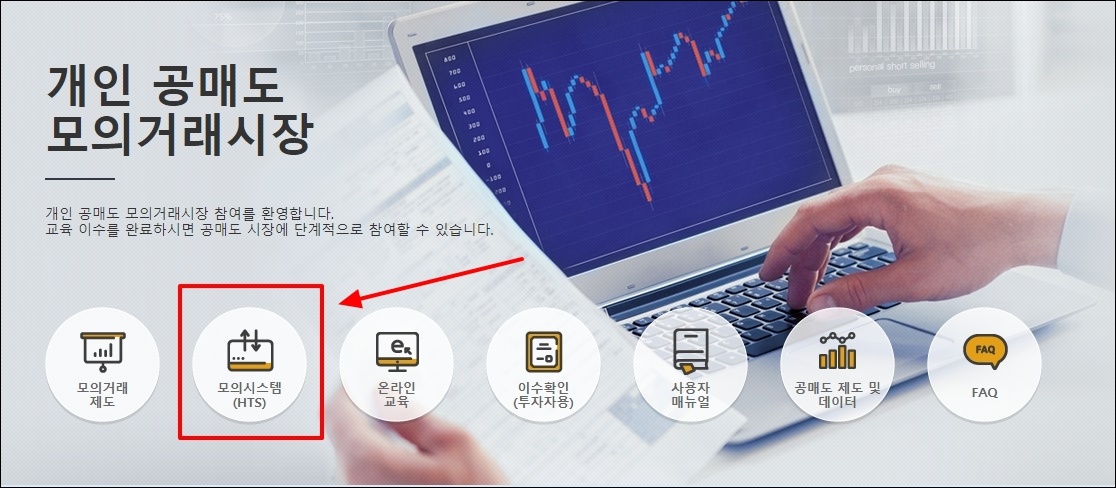사이트에 접속하면 모의 시스템 HTS가 있는데요. 클릭해 주세요. 해당 HTS를 사용하려면 사이트 회원가입이 되어 있어야 해요.