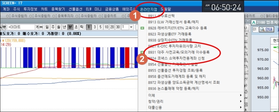 공매도 관련 교육과 모의투자를 받으면 관련 번호를 얻게 되는데요. 이걸 가지고 증권사 HTS를 통해 이수 등록을 할 수 있어요. HTS를 켠 후 메뉴에서 온라인 지점을 클릭해 보세요. 그럼 대주 사전교육 및 모의거래 이수등록 메뉴가 있을 거에요.