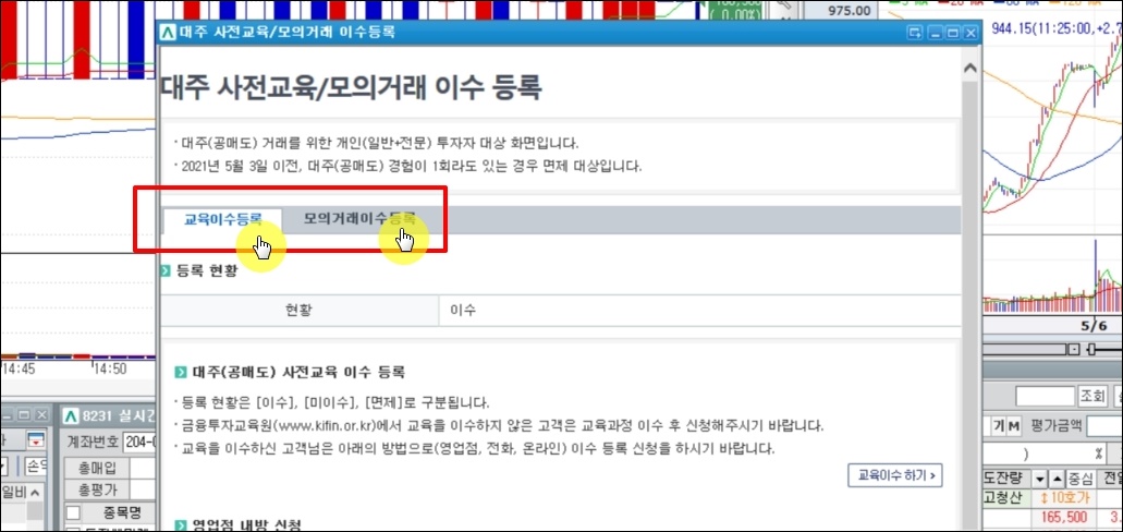 교육이수등록과 모의거래이수등록을 차례대로 해주면 돼요. 제 경험으로는 교육은 바로 이수등록이 완료되었고, 모의거래의 경우 1시간 정도 시간이 걸렸던 것 같아요.