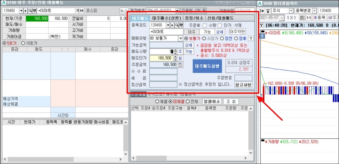 일반적인 주문창과 비슷하게 생겼는데요. 다른 점이 있다면 매수 탭 대신에 대주매도가 있고, 매도 탭 대신에 대주매수가 있어요. 주식 매매를 할 때와 같이 대주매도를 통해 증권을 팔면 되고, 나중에 대주매수를 통해 증권을 사서 상환하면 돼요. 모의투자를 조금만 경험해보면 개인 공매도 하는법이 전혀 어렵지 않다는 것을 알 수 있을 거에요.