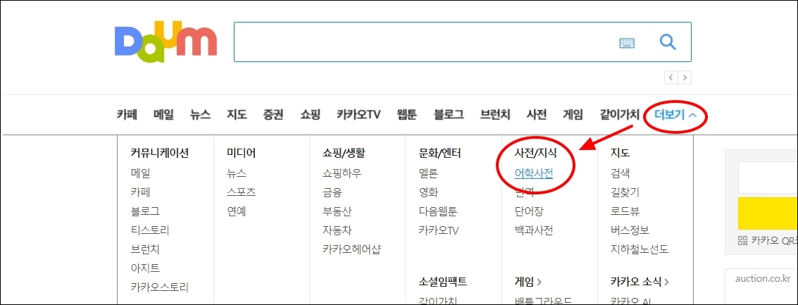 국내 유명 포털인 네이버와 다음에서는 서비스 이용자들이 편하게 이용할 수 있는 사전 서비스를 제공하고 있습니다. 다음의 경우 메뉴에서 "더보기" 버튼을 누르면 사전 서비스를 쉽게 찾을 수 있어요.