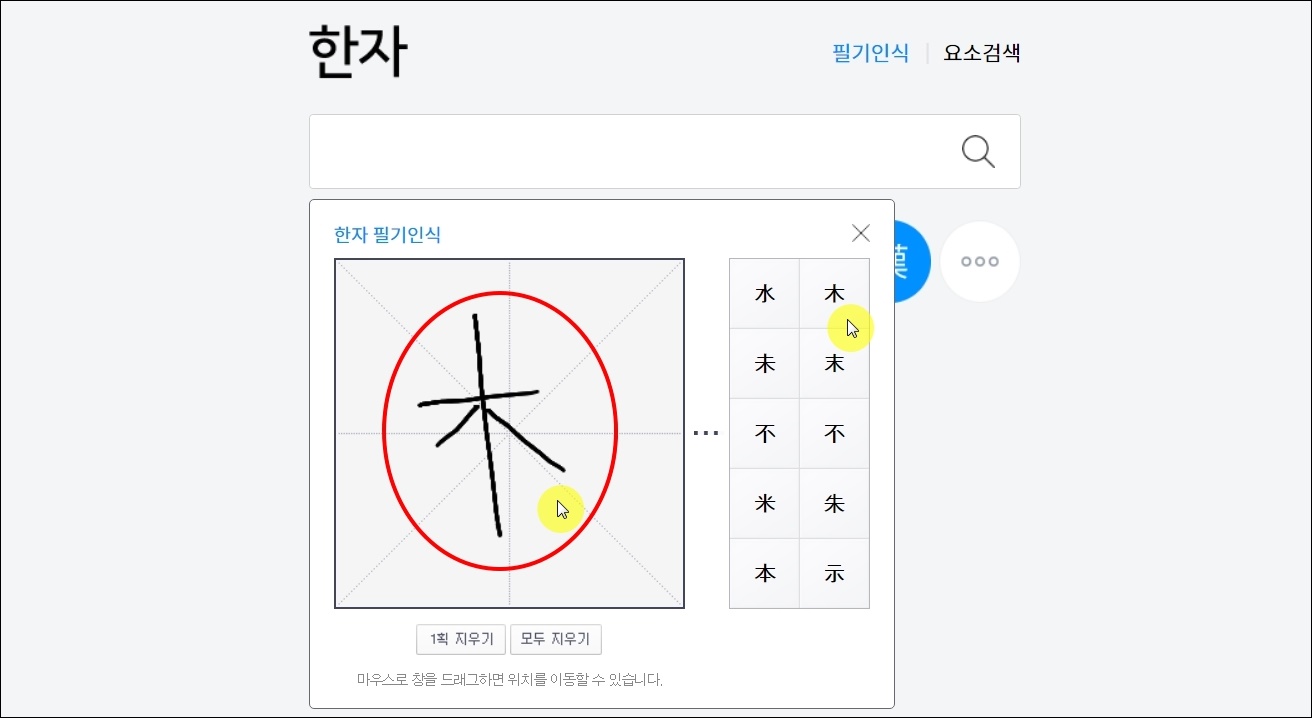 필기인식기에서 제가 그린 한자를 클릭하니 이렇게 사전 검색기 입력창에 해당 문자가 입력되었네요. 이 상태에서 검색 버튼을 클릭해 주세요.