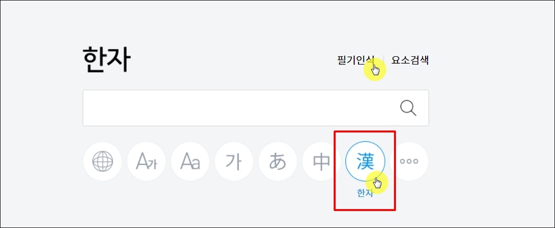 다음의 사전 서비스를 통해 한영, 영영, 한글, 중국어, 일본어 사전을 이용할 수 있는데요. 여기에서 한자 사전을 선택해 주세요. 이 상태에서 "필기인식"을 클릭해 보세요. 그럼 쉽고 빠르게 사용할 수 있는 검색 프로그램이 나타납니다.