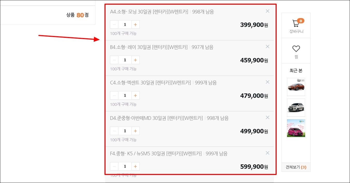 온라인으로 한달 렌트카 비용을 알아볼 수 있는 업체가 15건이나 되네요. 겉으로 보이는 가격은 최소 가격이기 때문에 정확한 비교를 하기가 어렵습니다. 그렇기 때문에 상품을 클릭해서 상세 페이지를 확인할 필요가 있습니다.
