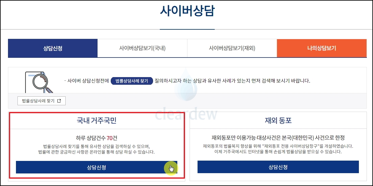상담신청 버튼을 클릭한 후 묻고자 하는 내용을 입력하면 됩니다. 무료 법률상담을 받기 이전에 유사한 상담 사례가 있는지 확인해 보는 것이 좋습니다. "법률상담사례 찾기" 버튼을 클릭하면 사례를 무료로 모두 찾아볼 수 있습니다.