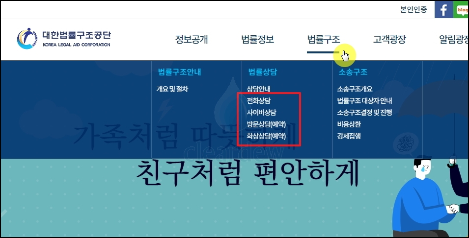 사이버상담, 방문상담, 화상상담을 무료로 이용하기 위해서는 대한법률구조공단 홈페이지에 접속합니다. 안내가 잘 되어 있어서 누구나 쉽게 이용이 가능합니다.